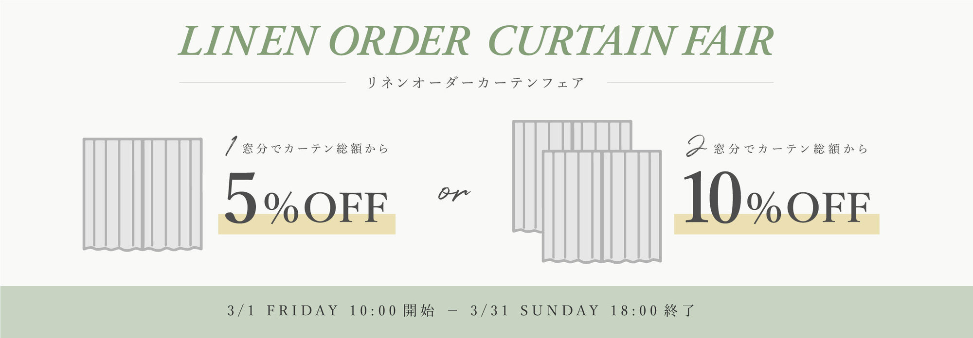 リネンオーダーカーテン1窓分ご注文の場合カーテン総額の5%OFF。2窓以上の場合はカーテン総額の10%OFFとなるお得なフェアです。