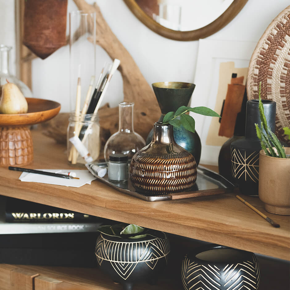 アフリカの民族紋様をイメージした「african coco(アフリカンココ)」シリーズの花器や植木鉢。ひとつあるだけでも絵になるけれど、複数置くほどに奥行きが生まれて世界が広がり、気持ちは海の向こうへ。