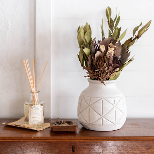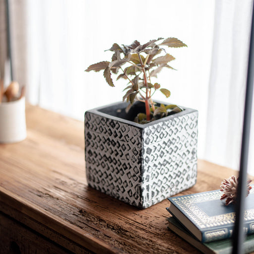 素朴な紋様とシンプルシルエットのオリジナル陶器ポット シンプルなシルエットが汎用性の高い陶器製の植木鉢。控えめなダイヤ紋様がアクセントになっているヴィンテージ仕上げ。さりげなく床に置くだけで絵になります。 優しいホワイトの艶がある釉薬で仕上げています。職人により手作業で作られているので一...