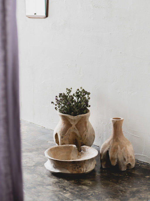 雰囲気も表情も個性いっぱいで、既製品では表現できないアート作品のようなアイテムです。お好みの形状はお選びいただけませんが、飾り気のない素材感とプリミティブな仕上がりは、届いた瞬間からクリエイティブに、様々なスタイリングアイデアをイメージさせてくれるでしょう。