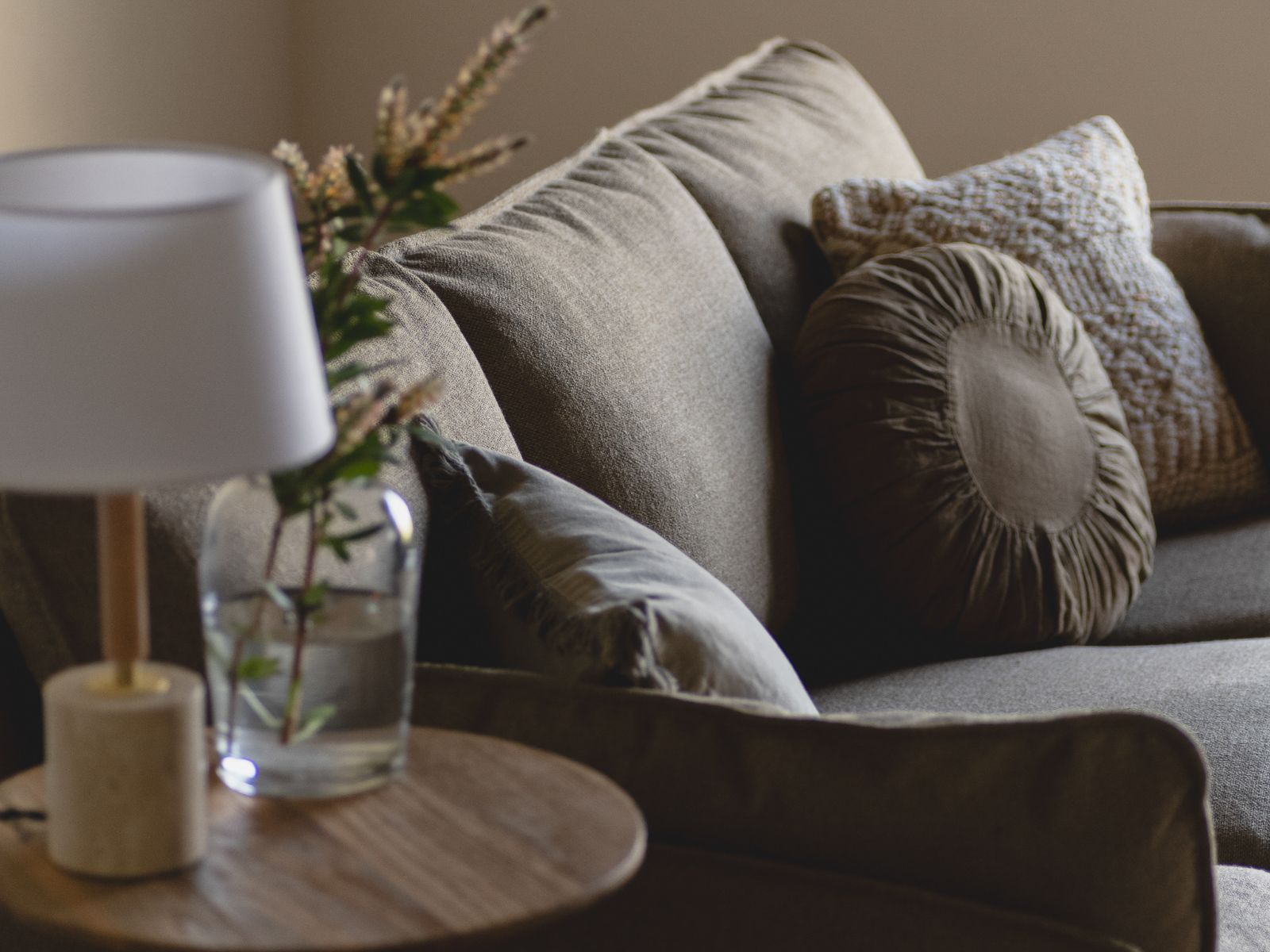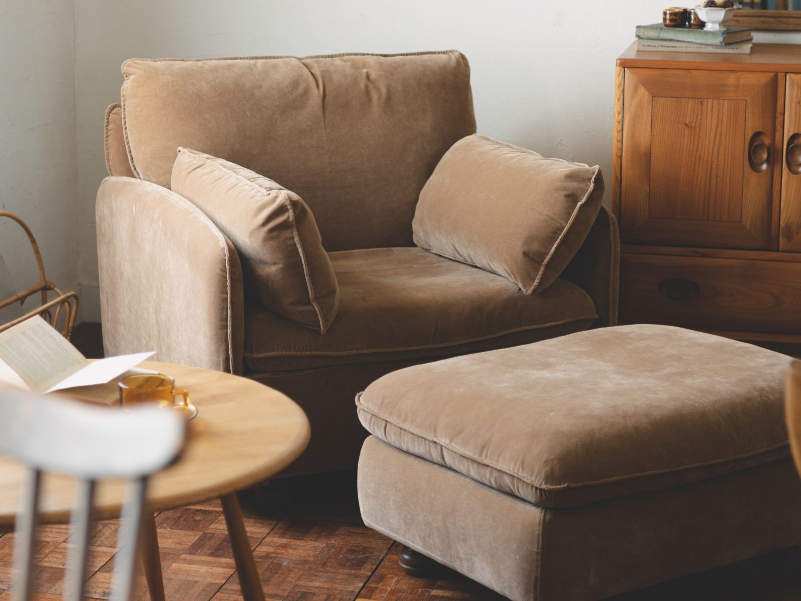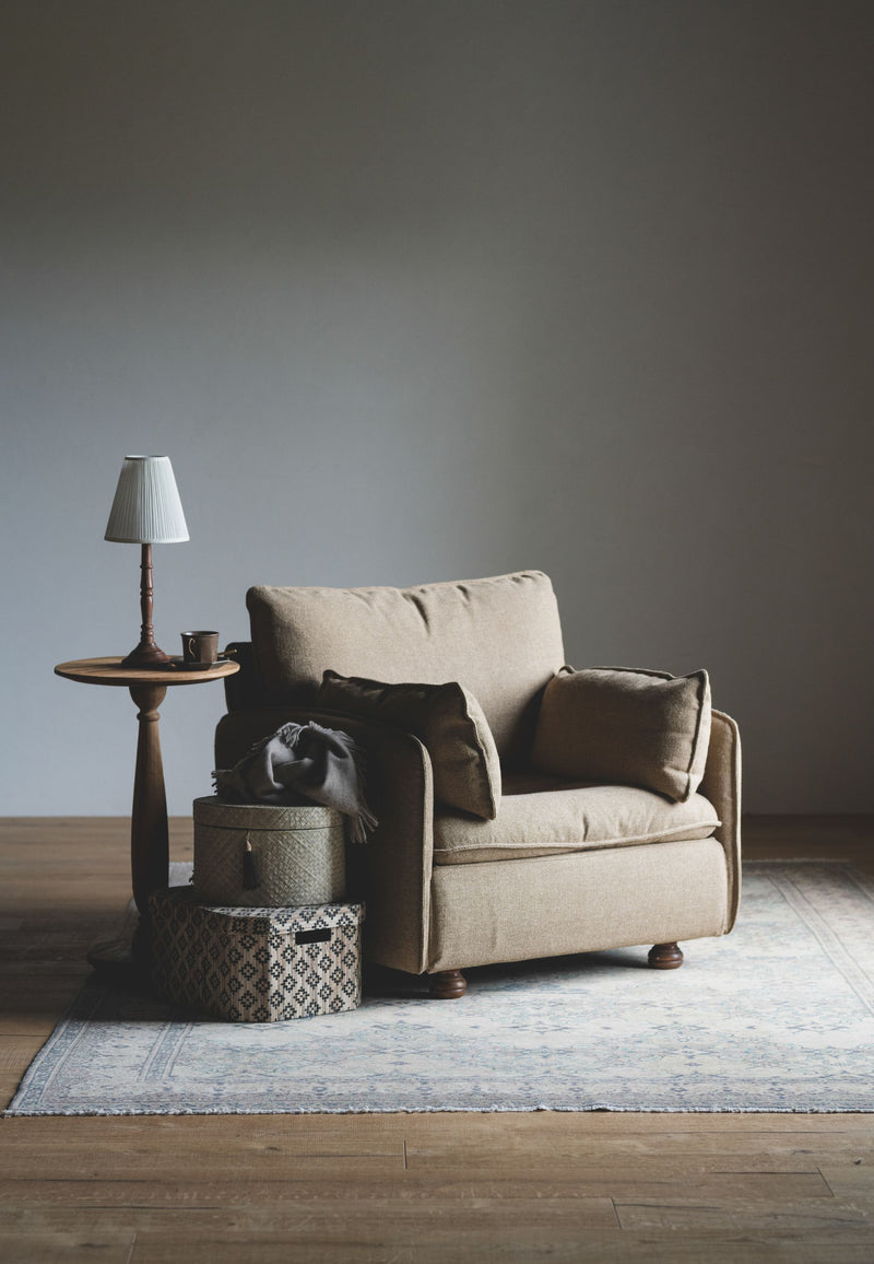 カバーは2種類。独自のラフ仕上げ加工を施したオリジナルのコットンベルベットと、天然素材混に温かみと深みを感じるタッシュ。落ち着いたベージュのマニッシュな色味は、上品なミッドセンチュリーや、ヴィンテージとも相性の良いカラーです。