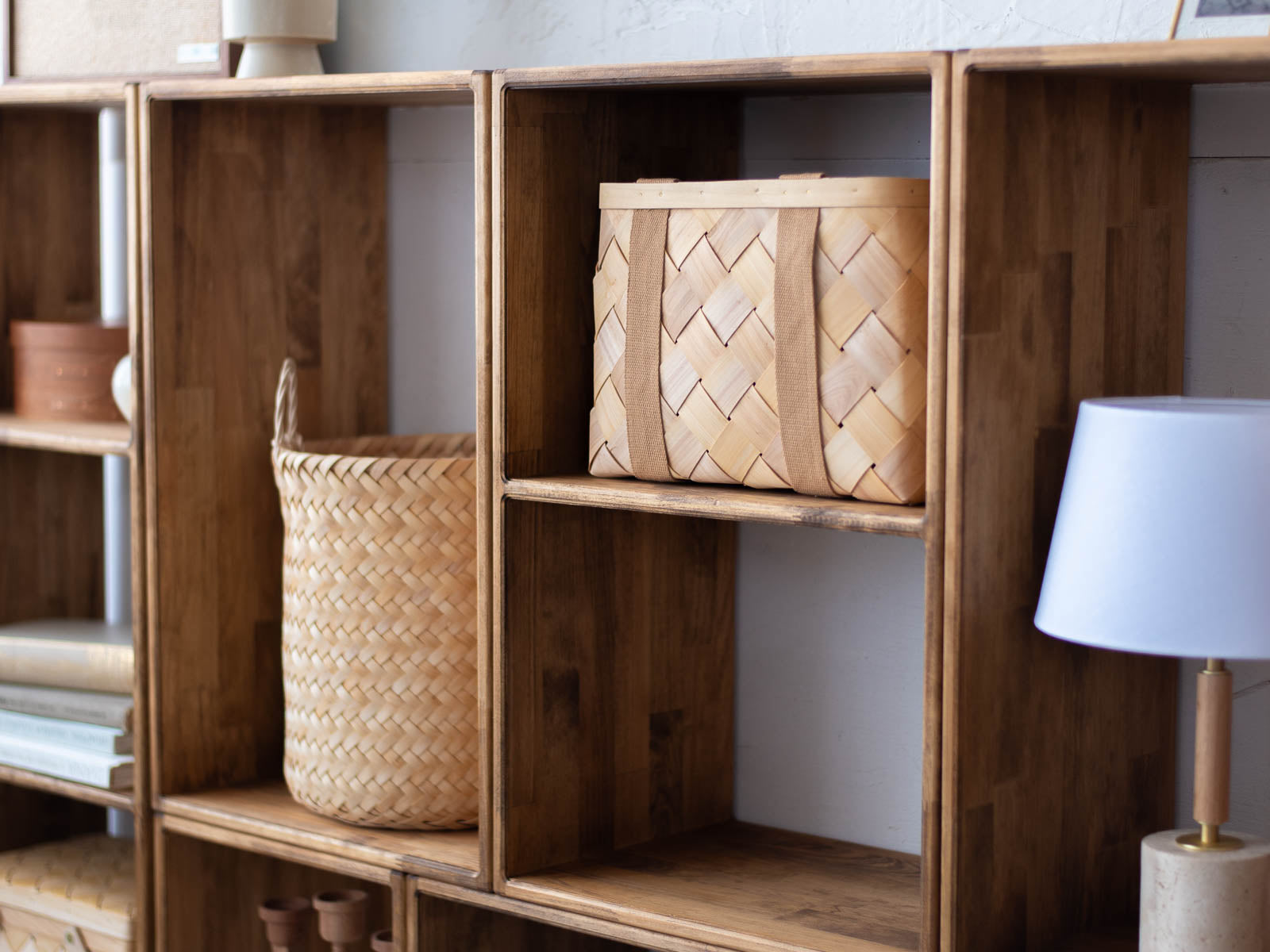 リビング、書斎、ベッドルーム、子供部屋など、あらゆる場所に自然と馴染むシンプルなデザイン。カラーは木のぬくもりを感じるミディアムブラウンです。流行や季節感を問わないベーシックで穏やかな佇まいなので、インテリアスタイルを問わず、幅広いテイストの小物や家具を組み合わせて、タイムレスにお使いいただけます。