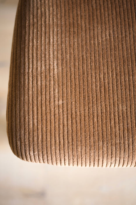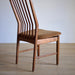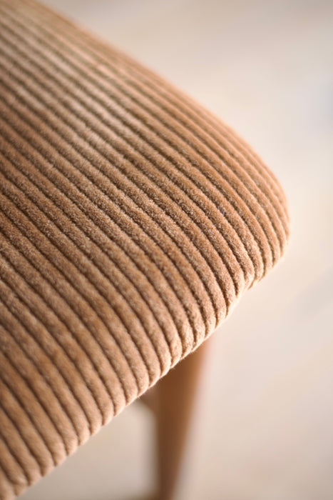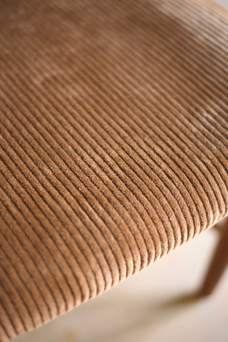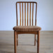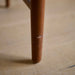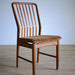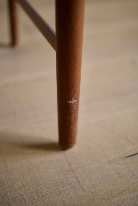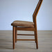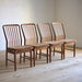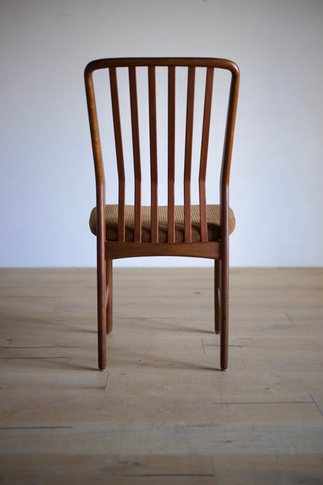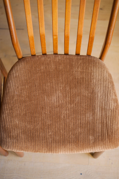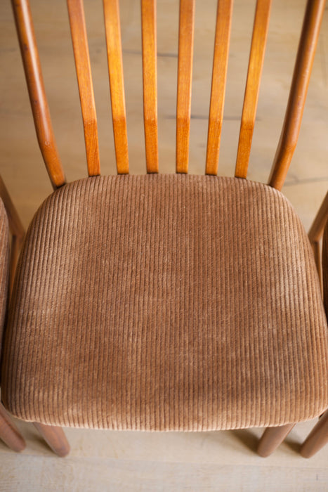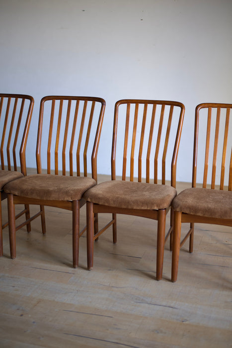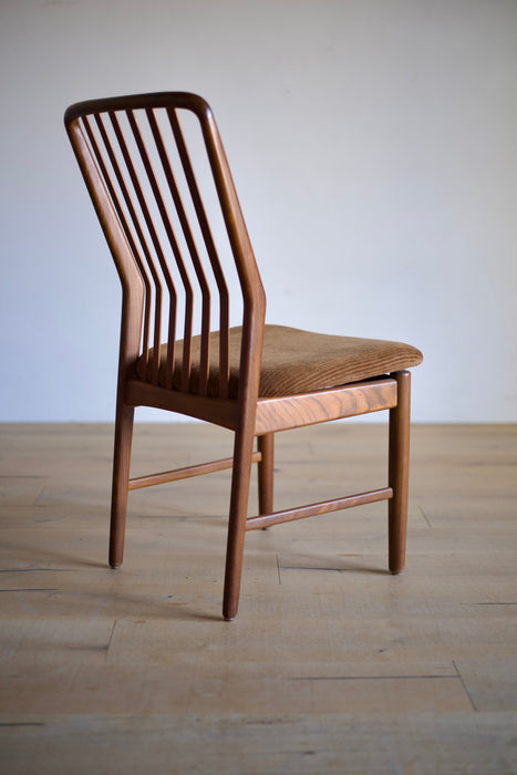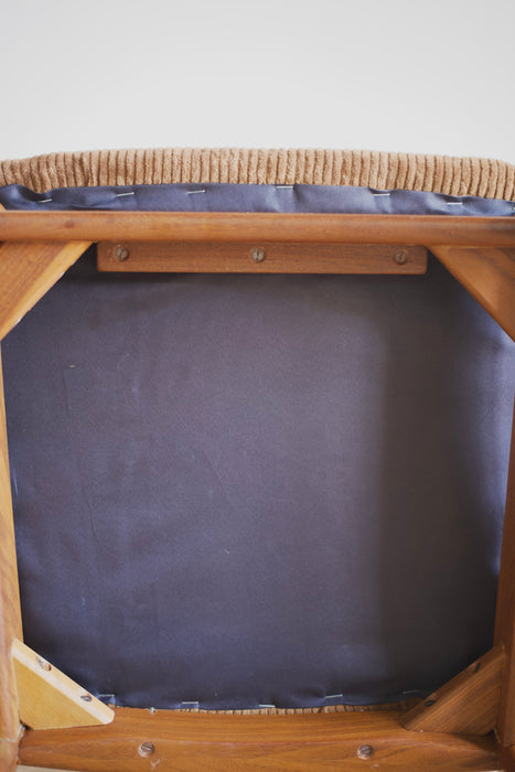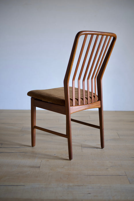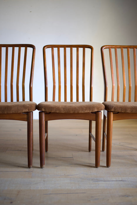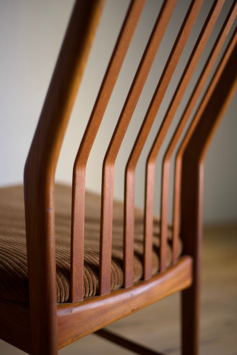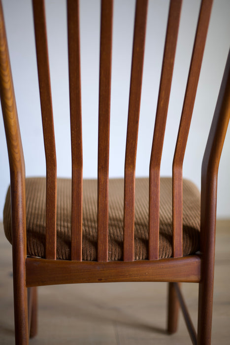 A set of 4 teak chairs made in Denmark by Svend Aage Madsen. Featuring a beautifully designed backrest, these chairs offer a stylish yet comfortable seating experience. The seat fabric has been reupholstered with our original corduroy.