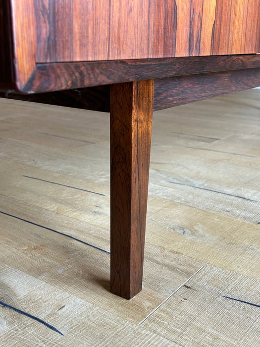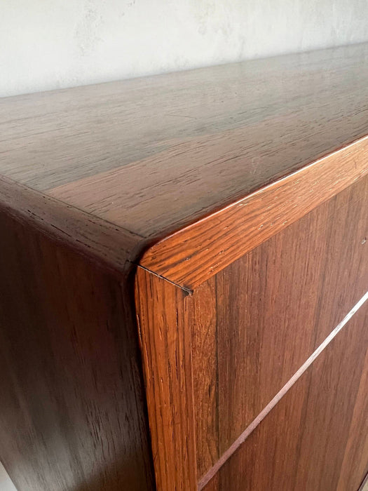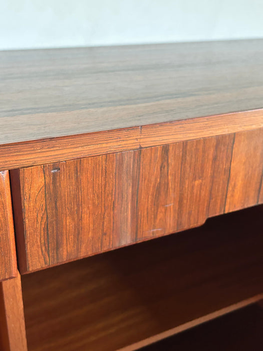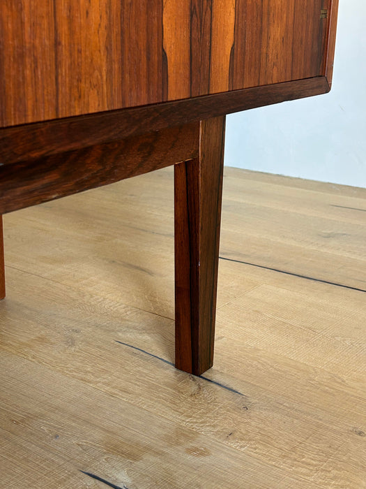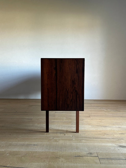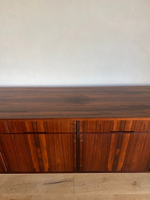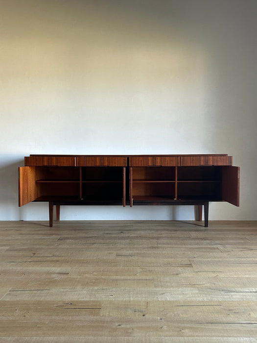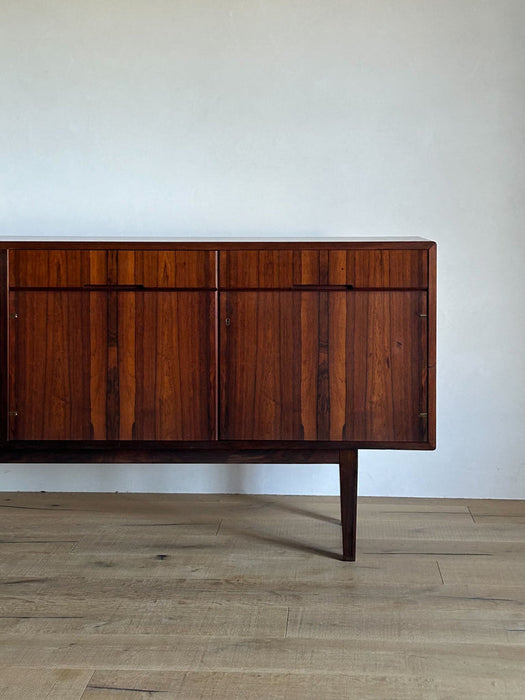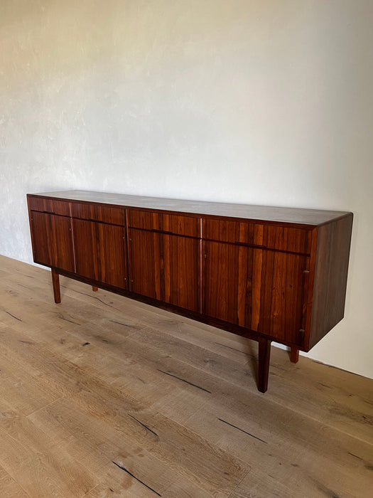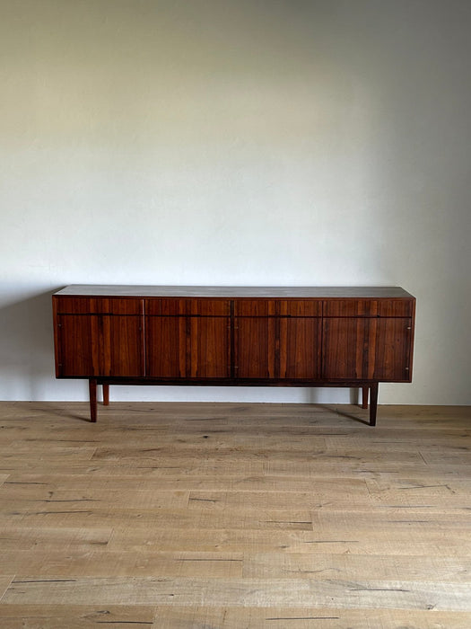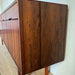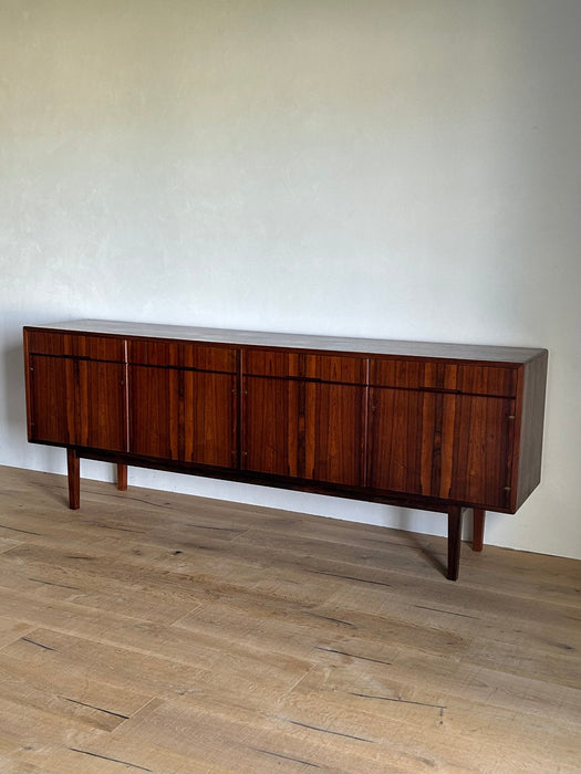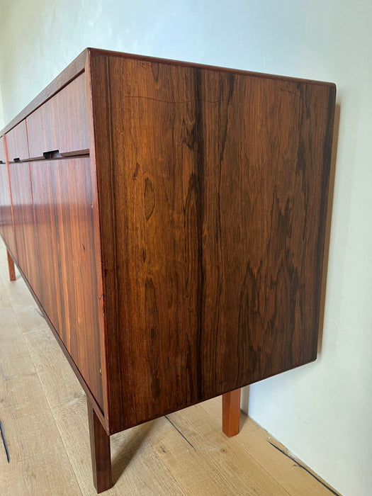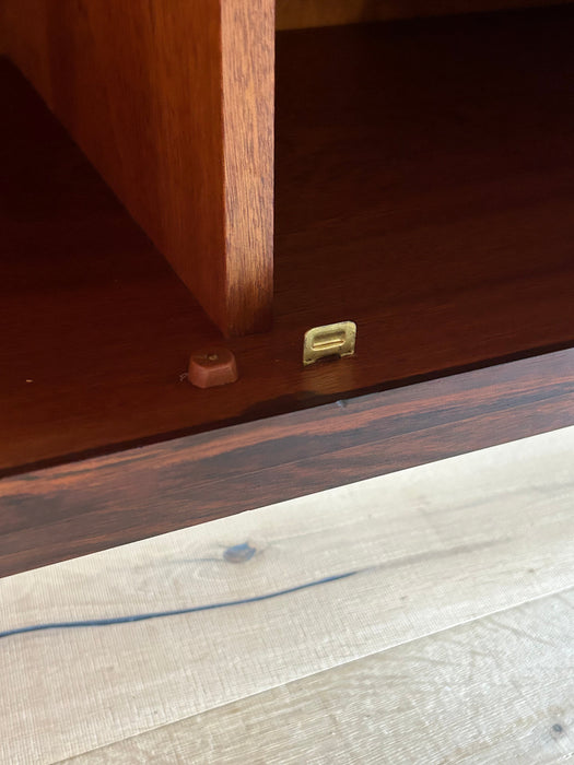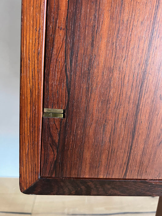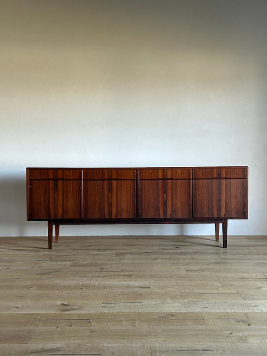 A rare rosewood sideboard made by the Swedish company "Asljunga Mobelfabrik" from the 1960s Nordic Sweden. The simple design is beautiful down to the details, featuring hand-carved handles formed by shaving the drawer fronts and solid brass hinge parts. The storage section includes four drawers and four cabinet doors. The internal size of one cabinet door is approx. W52cm; when the shelf is removed, the height is approx. 40cm, and when the shelf is installed, approx. 19.5cm. Overall, the structure is solid and there are no issues with use. There are minor scratches, repair marks, and several spots on the top board where the wood grain or stains appear darker due to aging. Please check the images for details.