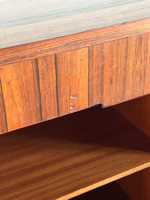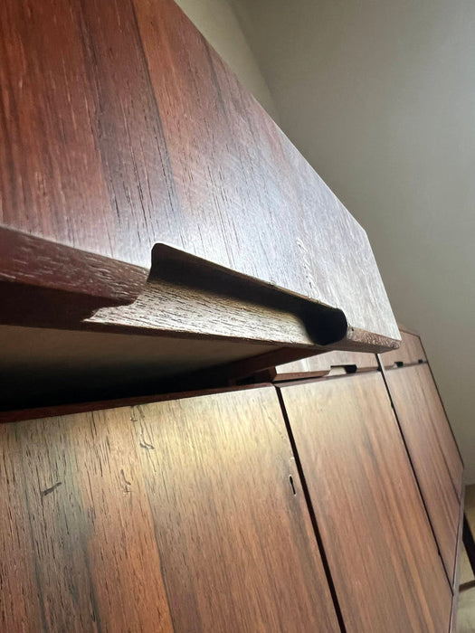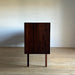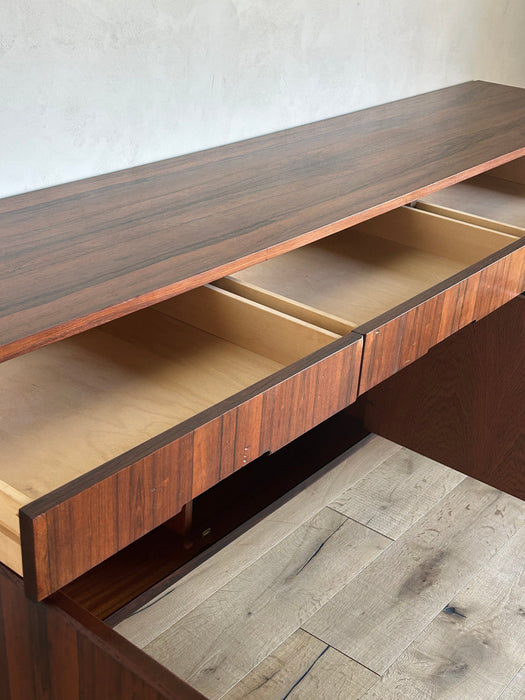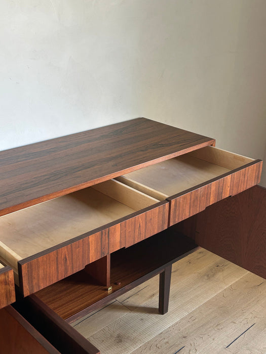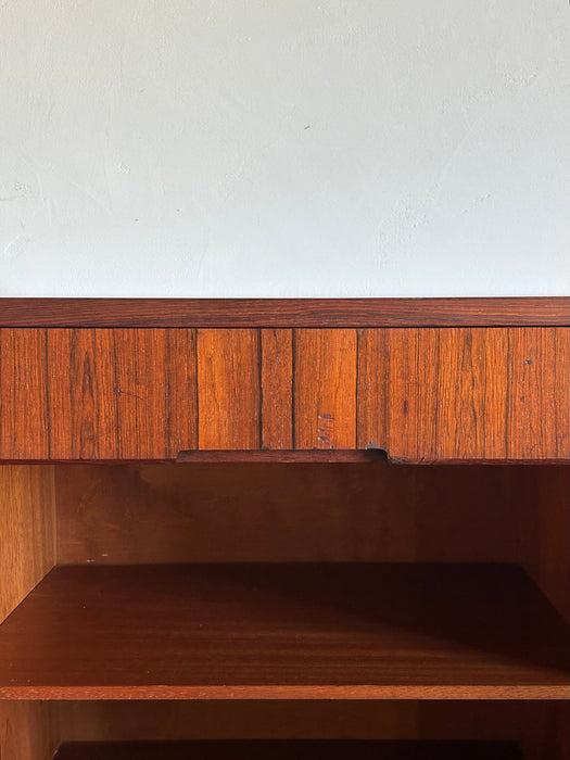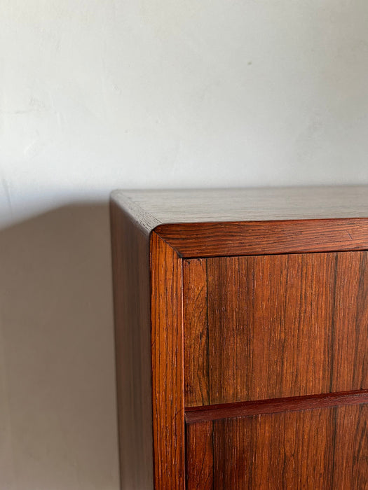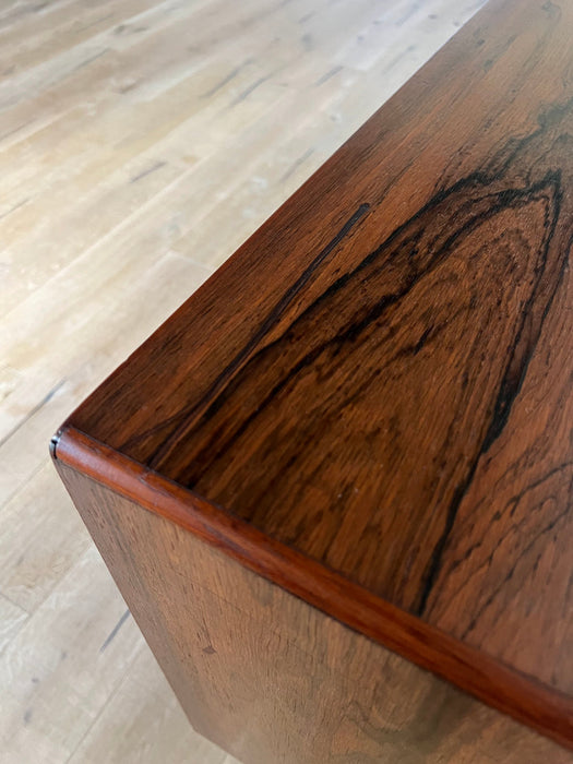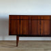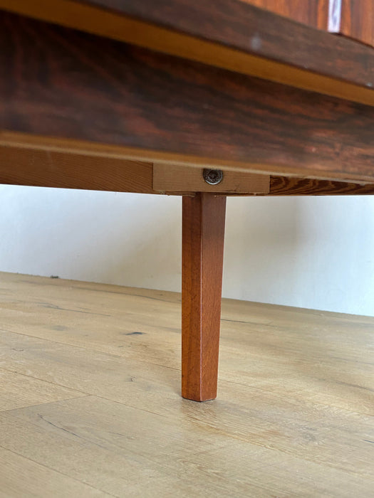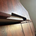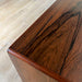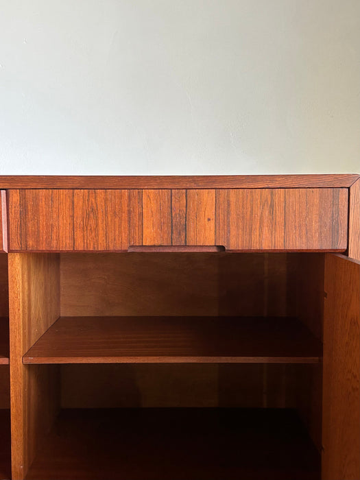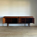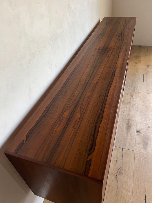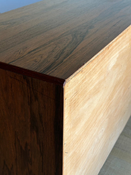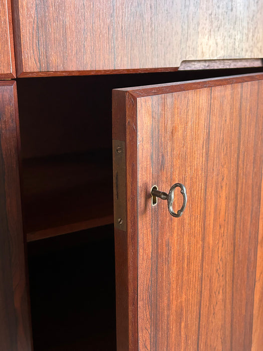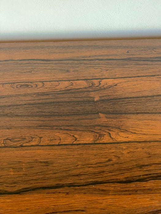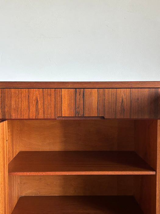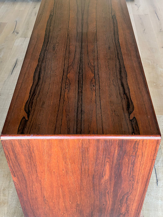 A rare rosewood sideboard made by the Swedish company "Asljunga Mobelfabrik" from the 1960s Nordic Sweden. The simple design is beautiful down to the details, featuring hand-carved handles formed by shaving the drawer fronts and solid brass hinge parts. The storage section includes four drawers and four cabinet doors. The internal size of one cabinet door is approx. W52cm; when the shelf is removed, the height is approx. 40cm, and when the shelf is installed, approx. 19.5cm. Overall, the structure is solid and there are no issues with use. There are minor scratches, repair marks, and several spots on the top board where the wood grain or stains appear darker due to aging. Please check the images for details.