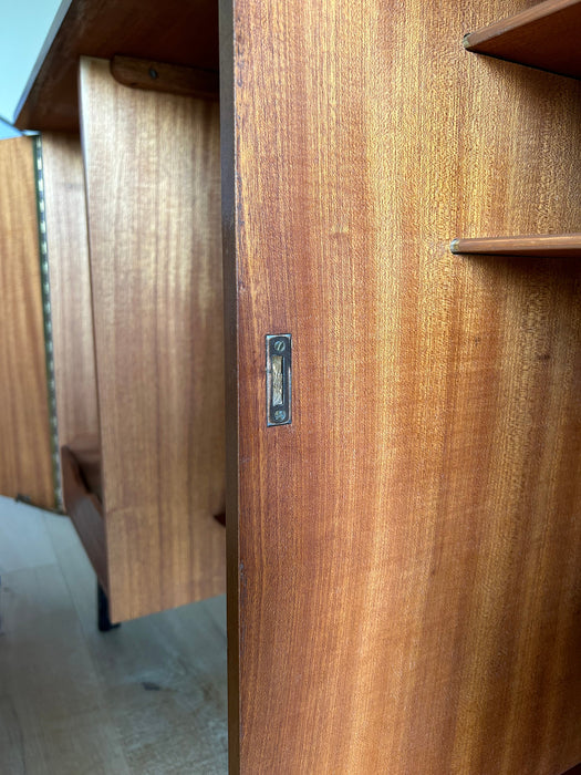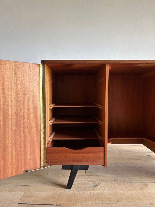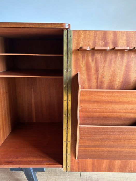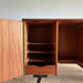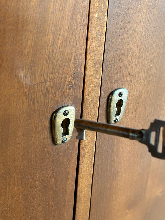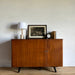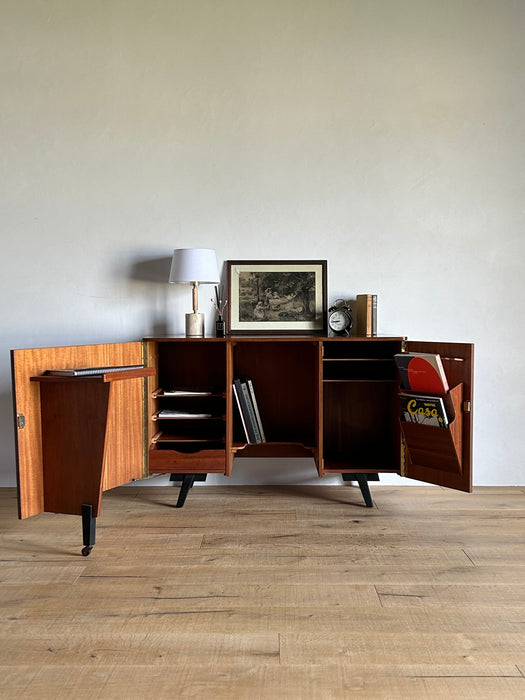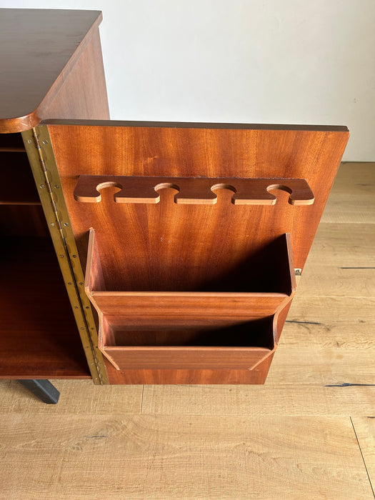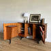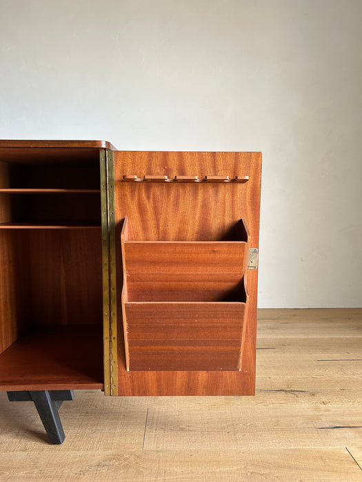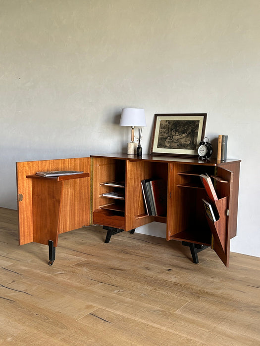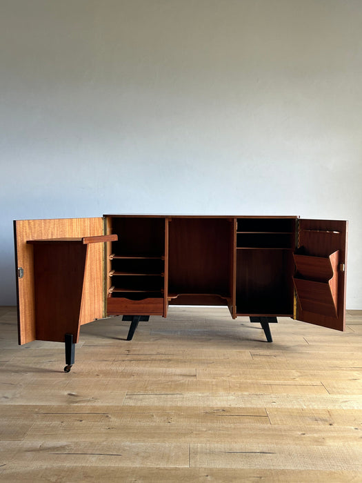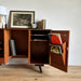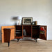 At first glance, it looks like a sideboard cabinet, but when you open both doors, it quickly transforms into a multifunctional desk designed for ease of use. Although it is an unbranded piece, it is a British-made transformed cabinet desk influenced by Scandinavian furniture of the time, with a solid construction. When you open the doors, you can immediately focus on your work, and when you close them, you can instantly tidy up, making it an ideal cabinet desk for living rooms and similar spaces. Please inquire for detailed dimensions and opening measurements.