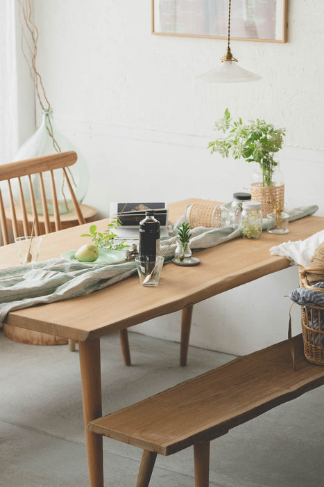 素朴な風合いと質感、経年変化を楽しんでいただけるようにあえてほぼ無塗装で仕上げており、テーブルの天板には風合いを損なわない程度の簡易な撥水加工を施しております。 ご使用の環境にもよりますがその効果は半年〜1年前後で弱まり、シミや色の変化が出やすくなります。 綺麗な状態を長続きさせたい方は、水気や高温のものに十分注意し、こまめなメンテナンスをお勧めします。 -