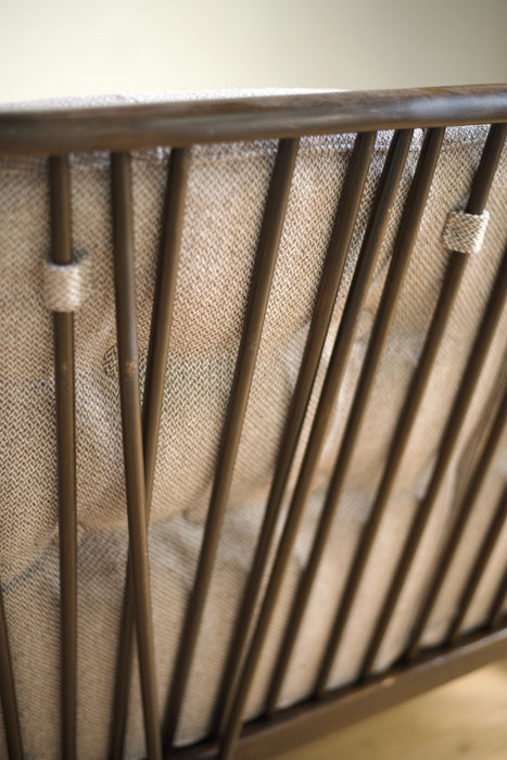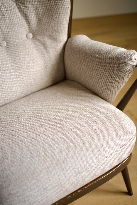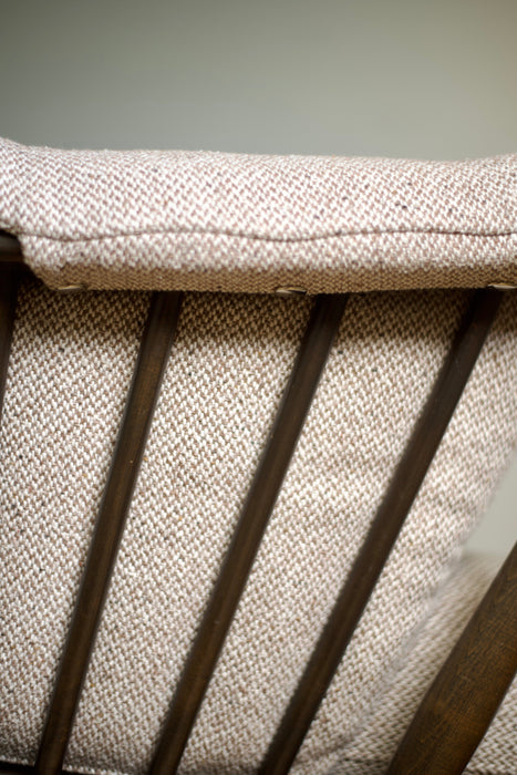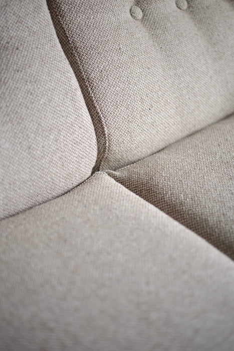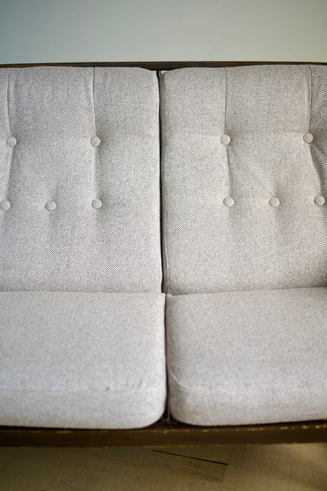 ファブリックには、当店オリジナルのホワイトブラウンツイードを使用。ダークブラウンの木部とのコントラストが、上品かつシックな印象を演出します。ぜひ、最高の座り心地をご体感ください。
