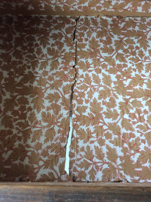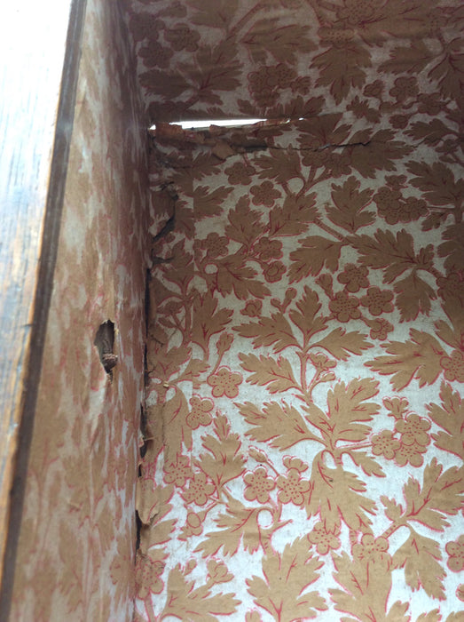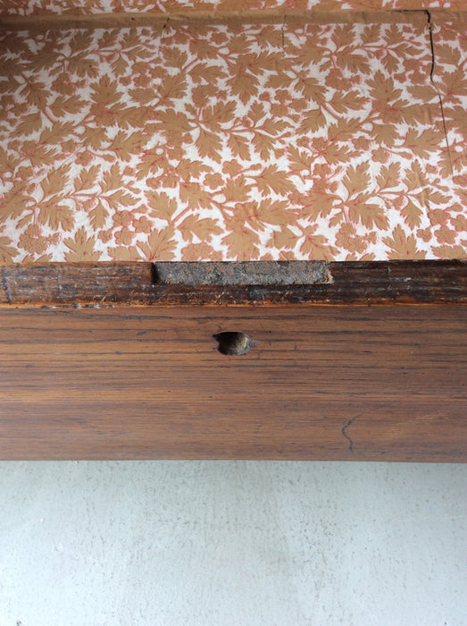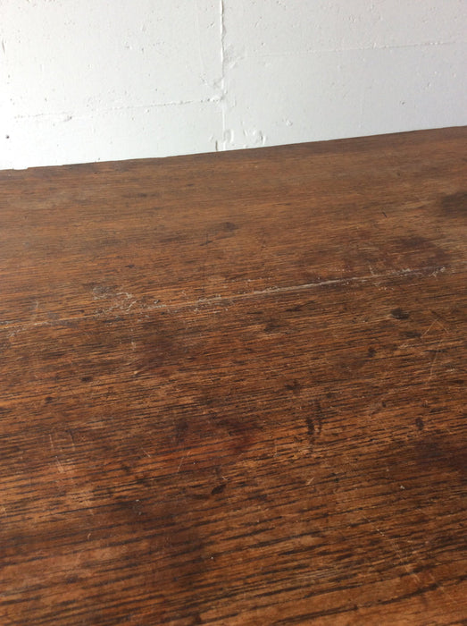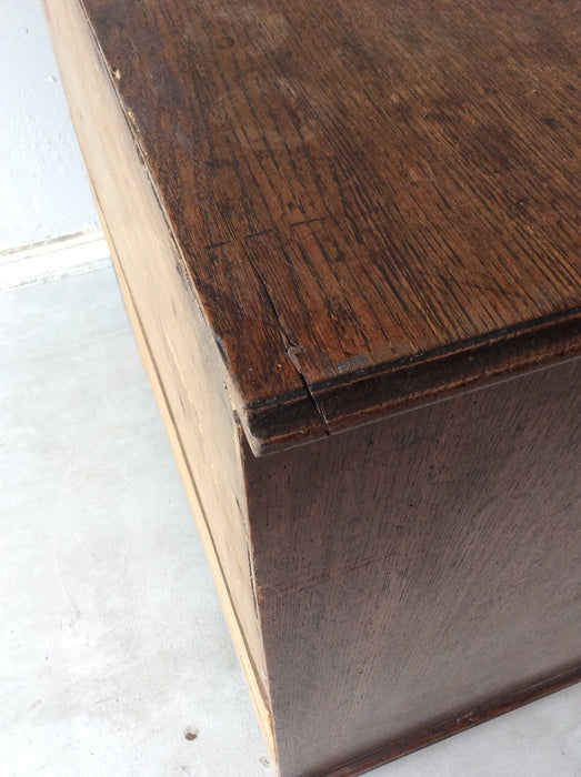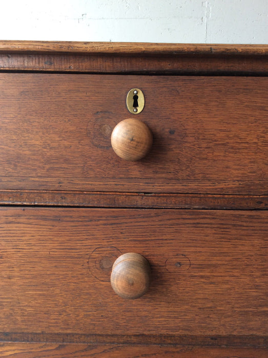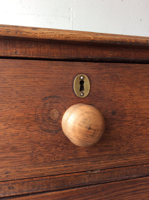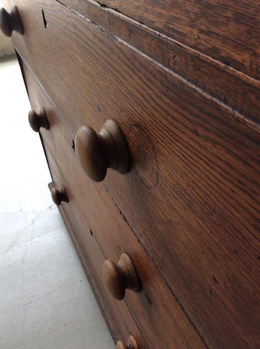イギリスのヴィクトリアン時代のオーク製チェストです。修復跡からハンドルはオリジナルではございません。デコラティブな金物ハンドルも良いですが、シンプルな木製ハンドルも似合っています。