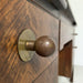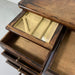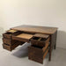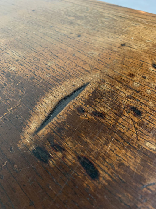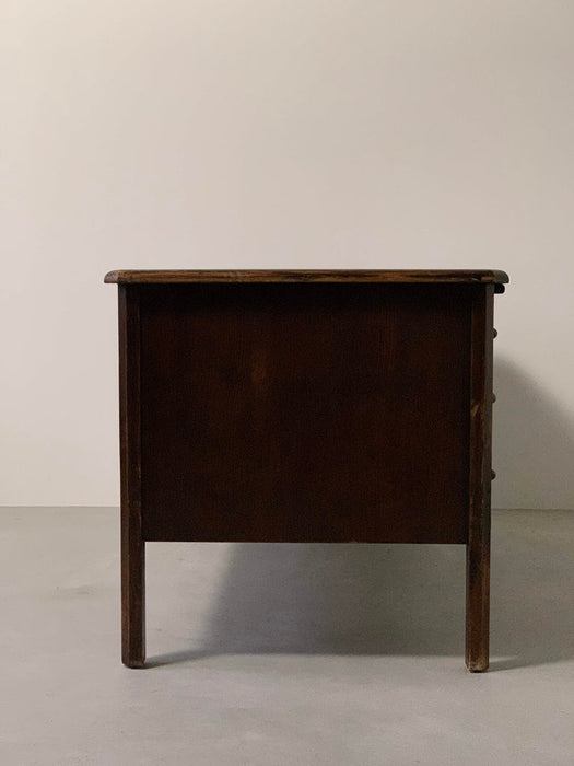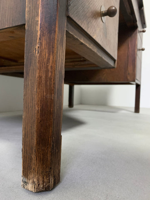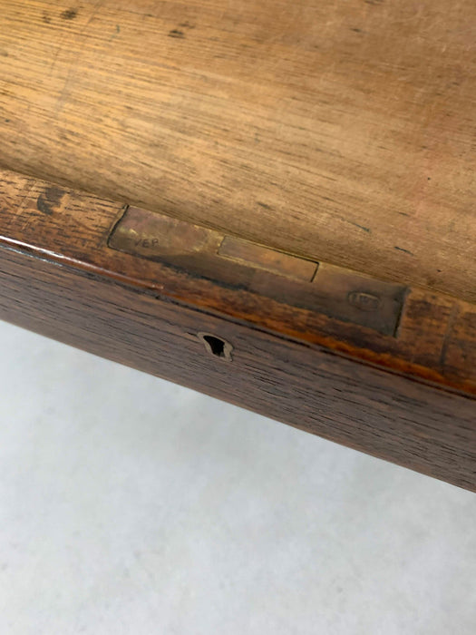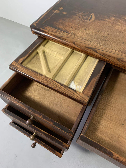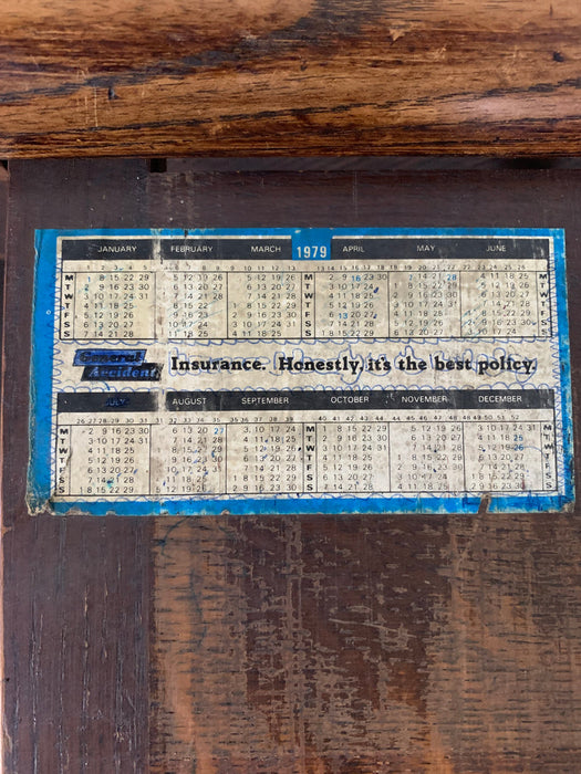 イギリスのリヴァプールで買い付けたオークデスク。とにかく素晴らしい。全体のビンテージならではの存在感に圧倒されます。当時の塗装が経年変化で剥げてオーク無垢のすばらしい木目が現れています。深く、大きな古傷が刻まれていますが、個人的にはここが一番のお気に入りポイント。引き出しの化粧はオークの木目を活かしたヘリンボーン柄。ハンドルは美しく引き出しやすい球形デザインの真鍮製。右上の引き出しトレイには前オーナーが貼ったと思われる1979年のカレンダーが見受られますが、おそらくデスクはそれより以前につくられたものでしょう。右下部引き出しのハンドルが欠損しているような跡が見られますが、この引き出しのみ深さがある引あき出しですので、ダミーで付いてたものと推測され、使用には問題ございません。